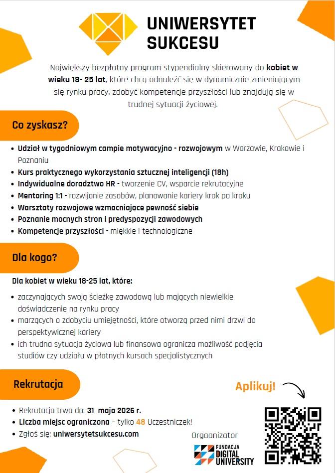 Uniwersytet Sukcesu - szansa dla młodych kobiet w trudnej sytuacji życiowej - bezpłatny program stypendialny